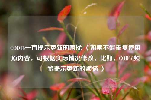 玩家遭遇《使命召唤16》(COD16)一直提示更新的困扰,这一问题给玩家带来诸多不便,可能导致游戏无***常流畅运行,影响游戏体验,玩家们尝试了各种 *** 来解决,如检查 *** 连接、重启游戏和设备等,但仍持续收到更新提示,该情况引发玩家广泛关注与讨论,大家纷纷在论坛等平台分享自己的经历和解决办法,希望能找到有效的解决方案,以摆脱COD16一直提示更新的烦扰,让游戏能稳定运行,畅享游戏乐趣。