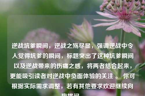 本文聚焦于“逆战之殇,那些让人直呼坑爹的瞬间”,讲述了在逆战过程中出现的诸多令人无奈、愤怒到直呼坑爹的场景,可能涵盖游戏关卡设计不合理,难度过高或过低影响体验;武器装备存在明显缺陷,性能不稳定或不符合预期;队友配合不佳,关键时刻掉链子等状况,通过对这些坑爹瞬间的剖析,展现逆战中存在的问题,让玩家们更加了解游戏的痛点,也引发对如何改善游戏品质、提升玩家游戏感受的思考,助力游戏不断优化升级。