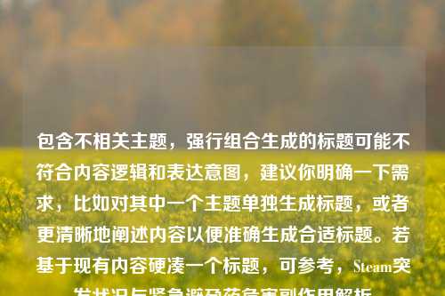 存在逻辑不连贯及主题混乱的问题,前半部分“Steam突发状况全解析”与后半部分“紧急避孕药的危害和副作用”毫无关联。,Steam突发状况全解析”:Steam平台突发状况,需要全面深入剖析其具体表现、产生原因、对玩家及相关产业的影响等,以便更好地应对和理解这一情况。,紧急避孕药的危害和副作用”:紧急避孕药存在诸多危害与副作用,如影响月经周期、导致恶心呕吐、增加宫外孕风险等,了解这些能让使用者更谨慎对待并做好相应准备,重视其可能带来的不良后果。
