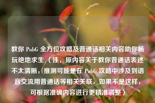 似乎不太完整且存在混淆,若仅围绕“教你PubG,全方位攻略助你畅玩绝地求生”来写摘要:,主要介绍了有关于PubG(绝地求生)的教学内容,提供全方位攻略助力玩家畅玩这款游戏,攻略涵盖游戏各方面要点,能帮助玩家更好地了解游戏机制、掌握战斗技巧、熟悉地图环境等,从而在绝地求生的世界中更顺利地展开游戏,提升游戏体验,让玩家更从容应对各种挑战,享受游戏乐趣,在虚拟战场中展现出更强实力。